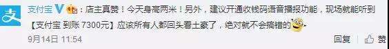 對此,支付寶官方表示,建議開通收錢碼語音播報(bào)功能,現(xiàn)場就能聽到“支付寶到賬7300元”,應(yīng)該所有人都回頭看土豪了,絕對就不會搞錯(cuò)的。