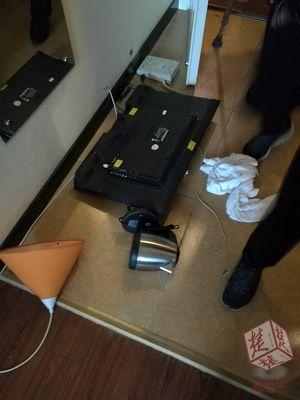 無(wú)奈,酒店工作人員只好用樓層房卡將6038號(hào)房打開。打開門,眾人驚呆了!一個(gè)沒穿上衣的小伙子正在玩手機(jī),房?jī)?nèi)的電話機(jī)、電水壺、臺(tái)燈、電視機(jī)都被砸了,甚至連床板都拆了……