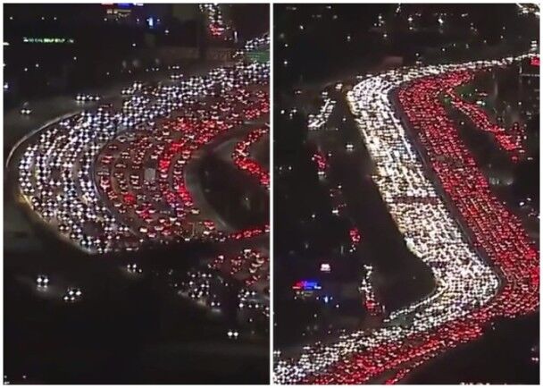 大批美國(guó)民眾在感恩節(jié)提早返回家鄉(xiāng),計(jì)劃與家人迎接這個(gè)節(jié)日。但過多的人流導(dǎo)致交通嚴(yán)重堵塞,洛杉磯的公路更出現(xiàn)超長(zhǎng)車龍,如河流般的紅白車燈更成為一道奇景。