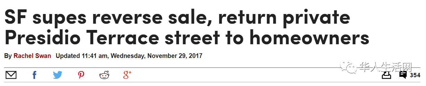 一對(duì)住在硅谷的年輕華裔夫婦以9萬(wàn)元購(gòu)得舊金山高尚住宅區(qū)太平洋崗的一條小街道Presidio Terrace,35棟超級(jí)豪宅業(yè)主試圖拿回街道所有權(quán)。舊金山市參事會(huì)昨日就事件舉行聽(tīng)證會(huì),市參事會(huì)最后以7對(duì)4通過(guò),取消Presidio Terrace街道的買(mǎi)賣(mài)。