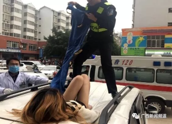 據(jù)來(lái)賓市公安局城警支隊(duì)東盟警務(wù)站覃警官介紹,當(dāng)天上午8時(shí)20分左右,他們接到群眾報(bào)警后趕到現(xiàn)場(chǎng),看到一名年輕女子躺在一輛面包車(chē)頂上,嘴唇出血,腰部有血跡。