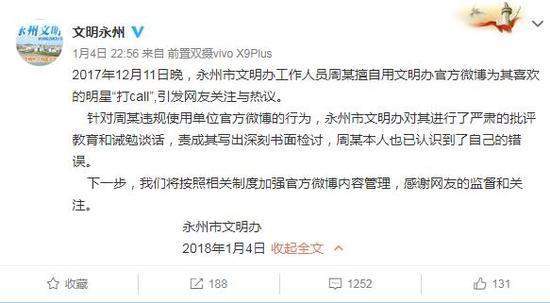 湖南省永州市文明辦官方微博:2017年12月11日晚,永州市文明辦工作人員周某擅自用文明辦官方微博為其喜歡的明星“打call”,引發(fā)網(wǎng)友關(guān)注與熱議。針對周某違規(guī)使用單位官方微博的行為,永州市文明辦對其進(jìn)行了嚴(yán)肅的批評教育和誡勉談話,責(zé)成其寫出深刻書面檢討,周某本人也已認(rèn)識到了自己的錯(cuò)誤。