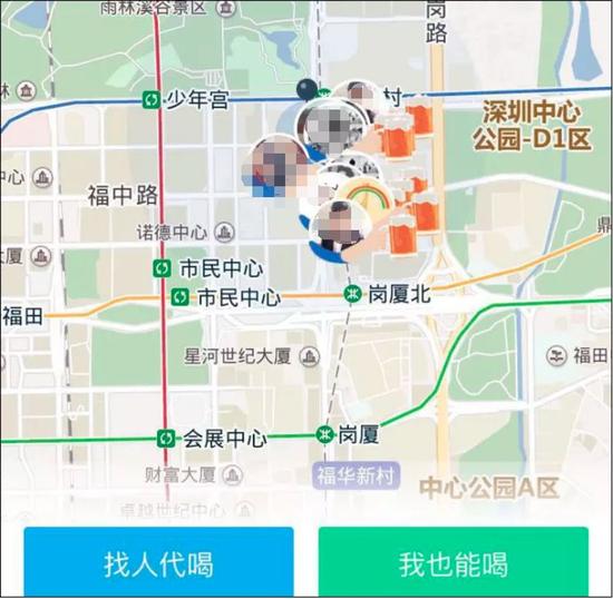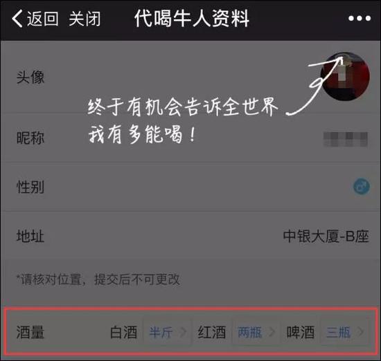 用戶在軟件中輸入或設(shè)置自己的位置,手機(jī)畫面的地圖上就會顯示出附近的 “代喝人”。這些“代喝人”在提供“代喝”服務(wù)之前,會提前在軟件上的個(gè)人信息中寫明自己的酒量、喜歡的酒類以及性別等基本信息。無論是誰都可以成為代喝人。