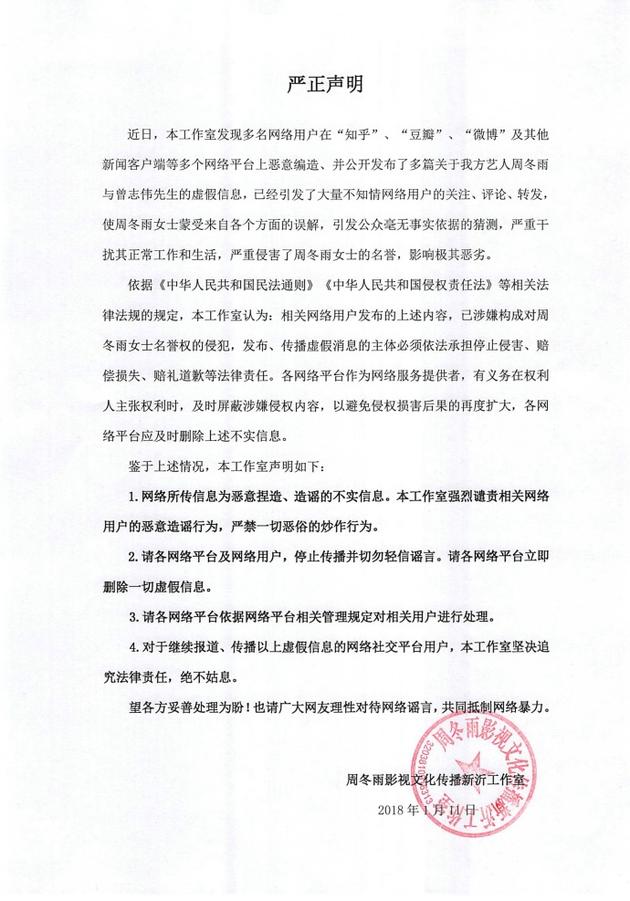 網(wǎng)易娛樂1月11日?qǐng)?bào)道 近日有傳聞周冬雨曾志偉關(guān)系親密,并因此獲得影視資源。對(duì)于此傳聞,周冬雨工作室今天中午發(fā)布聲明否認(rèn)此傳聞,稱此傳聞嚴(yán)重侵害周冬雨名譽(yù),影響極其惡劣。同時(shí)表示強(qiáng)烈譴責(zé)惡意造謠行為,希望廣大網(wǎng)友理性對(duì)待網(wǎng)絡(luò)謠言,共同抵制網(wǎng)絡(luò)暴力。