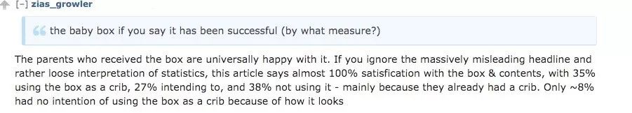 有網友說,“許多收到盒子的父母都很滿意,盒子里的東西可以給小寶寶用,而盒子本身還可以當成一個嬰兒床?!?/p>