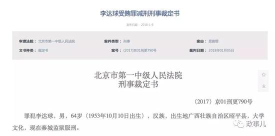1月9日,北京市法院審判信息網(wǎng)公布了李達(dá)球受賄罪減刑刑事裁定書,他被減去有期徒刑7個(gè)月。