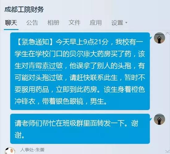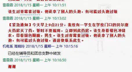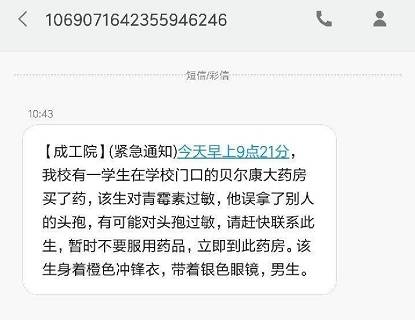 發(fā)布的消息內(nèi)容為:“【緊急通知】今早上9點21分,我校有一學(xué)生在學(xué)校門口的貝爾康大藥房買了藥,該生對青霉素過敏,他誤拿了別人的頭孢,有可能對頭孢過敏,請趕快聯(lián)系此生,暫時不要服用藥品,立即到此藥房。該生身著橙色沖鋒衣,戴銀色眼鏡,男生?!?/p>