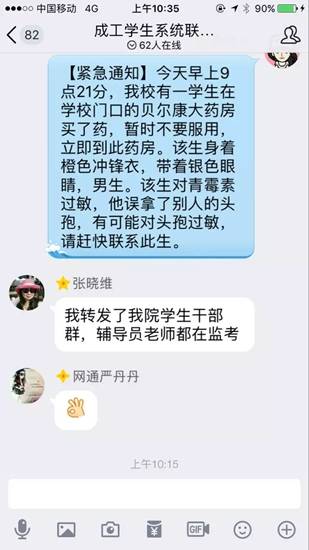 隨即,一場全校上下師生全員大尋找的緊急尋人隨即展開。校方在學(xué)校各個平臺及所有輔導(dǎo)員群將該消息發(fā)布出去,同時通過短信平臺向所有在校學(xué)生群發(fā)短信,希望找到該名拿錯藥的學(xué)生。
