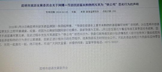 昆明市旅發(fā)委稱,2018年1月25日晚昆明市旅發(fā)委監(jiān)測(cè)到一條網(wǎng)絡(luò)輿情,“導(dǎo)游在旅游車上要求未購物的游客填寫說明”的視頻,26日昆明市旅游監(jiān)察支隊(duì)立即開展調(diào)查。經(jīng)查,該團(tuán)為云南旅冠國際旅行社操作,委派導(dǎo)游為王瓊。1月22日在麗江午餐后導(dǎo)游王某帶團(tuán)任務(wù)結(jié)束,因要求游客填寫意見單,在此過程中發(fā)生斥其游客為“鐵公雞”的惡劣行為。昆明市旅發(fā)委已就導(dǎo)游及旅行社涉嫌違反《旅行社條例》強(qiáng)迫或變向強(qiáng)迫游客購物的行為進(jìn)行立案調(diào)查,目前正進(jìn)行相關(guān)行政處罰程序,結(jié)果將及時(shí)向社會(huì)公示。