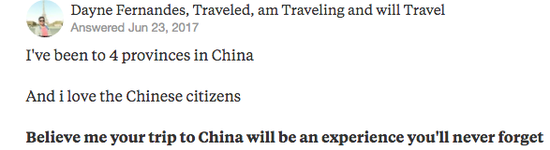 在美國(guó)問(wèn)答網(wǎng)站Quora上隨便一搜“Chinatravel”,海量結(jié)果秒秒鐘刷屏。外國(guó)網(wǎng)友不是在中國(guó)玩得不亦樂(lè)乎,就是在準(zhǔn)備來(lái)中國(guó)的路上。還有一些外國(guó)小伙伴們表示,來(lái)中國(guó)旅游,回國(guó)后各種崩潰+“水土不服”!