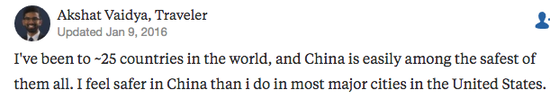 當(dāng)然,在中國(guó)旅游對(duì)老外的吸引力不只是便捷。一位去過(guò)全世界二十多個(gè)國(guó)家的外國(guó)驢友總結(jié)說(shuō),“中國(guó)是我去過(guò)的最安全的國(guó)家之一。我感覺(jué)在中國(guó)的大型城市比在美國(guó)安全多了。”