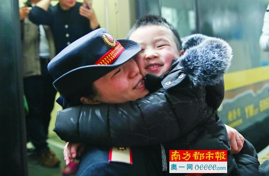 2月10日16時57分,深圳開往烏魯木齊的Z 230次列車??亢怅栒荆芍麑а蓐惪尚翀?zhí)導的短片《三分鐘》原型列車員劉鐘與兒子丁丁在站臺短暫相聚三分鐘。緊緊的相擁后告別在即,劉鐘眼中含淚,她還要上班至15日。不過,讓劉鐘特別開心的是今年她終于可以回家過除夕,這是11年來第一次。 南都記者 馬強 攝
