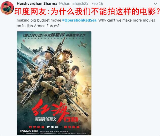 有意思的是,看到《紅海行動(dòng)》如此刷屏,一位印度網(wǎng)友顯然很是“眼紅”。他不無(wú)羨慕嫉妒地問(wèn)道:“為什么我們印度就不能拍這樣的電影呢?”