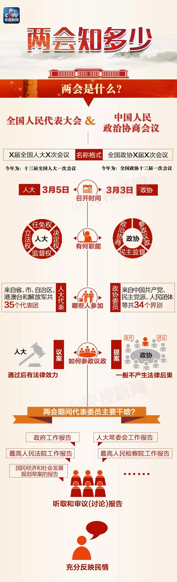 全國兩會(huì)年年開,但你知道這兩個(gè)“會(huì)”有何不同嗎?今年兩會(huì),除了新一屆全國人大代表和全國政協(xié)委員首次亮相之外,又有哪些值得關(guān)注的看點(diǎn)?一起看下面這張圖,提前了解2018年全國兩會(huì)。
