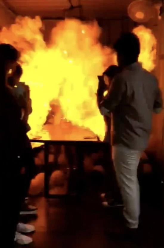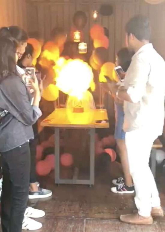 視頻剛開始的畫面是女孩準(zhǔn)備點燃生日蛋糕上的蠟燭,她的朋友們紛紛簇?fù)砩蟻恚檬謾C拍照,想要為她記錄這幸福的一刻。畫面中,女孩身穿一件灰藍(lán)色連衣裙,左臂內(nèi)側(cè)紋著一枚與眾不同的紋身圖案,四周被數(shù)十個粉色以及黑色的氫氣球圍繞著,接下來她劃了一根火柴,點燃了生日蛋糕上的蠟燭準(zhǔn)備許愿,緊接著,附近的氫氣球就突然發(fā)生了爆炸。房間里瞬間升起了巨大的火球,女孩也被火焰圍繞,她和朋友們都嚇得尖叫了起來。