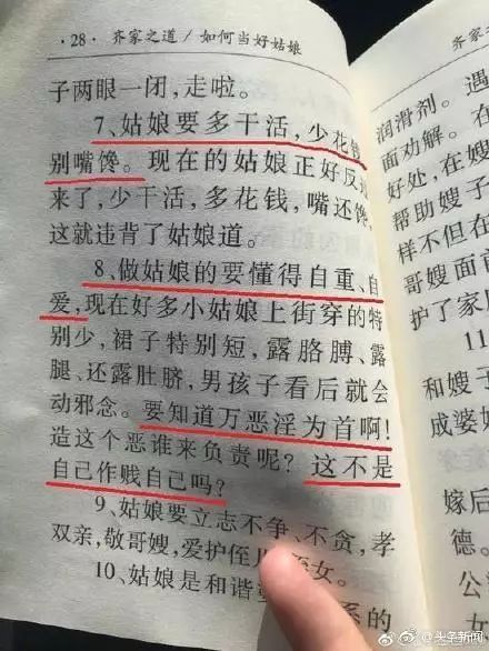 “姑娘要多干活,少花錢,別嘴饞,現(xiàn)在的姑娘正好反過來了,少干活,多花錢,嘴還饞,這就違背了姑娘道……”網(wǎng)友對小冊子上的一些話表示憤怒,認為這是打著傳統(tǒng)文化的旗號禁錮人們思想的歪理,內(nèi)容歧視女性、挑撥家庭和睦、挑戰(zhàn)醫(yī)學常識。