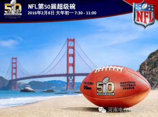 2月8日農(nóng)歷大年初一上午7:00到11:00,河南電視臺新聞頻道全球同步直播第50屆美國職業(yè)橄欖球年度冠軍總決賽,敬請收看。