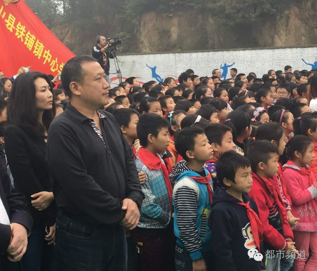 河南都市頻道總監(jiān)與信陽(yáng)老區(qū)的孩子一起升國(guó)旗唱國(guó)歌。