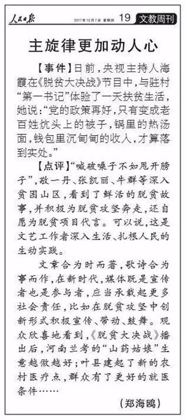 作為十九大的重要獻(xiàn)禮篇,《脫貧大決戰(zhàn)》第二季于10月11日正式播出。從第一季的“認(rèn)識貧困、了解貧困”,到第二季的“幫扶貧困、解決貧困”,固本求新,展現(xiàn)扶貧工作的現(xiàn)實(shí)意義和顯著成效,彰顯河南在全國脫貧攻堅中的責(zé)任和擔(dān)當(dāng)。節(jié)目播出之后,《光明日報》刊發(fā)《“土氣”背后的擔(dān)當(dāng)精神——關(guān)于大型公益扶貧節(jié)目<脫貧大決戰(zhàn)>》?!度嗣袢請蟆钒l(fā)表評論《主旋律更加動人心》,稱贊《脫貧大決戰(zhàn)》是“深入生活、扎根人民的生動實(shí)踐”,國務(wù)院扶貧辦、中宣部、省委省政府、省委宣傳部等多個領(lǐng)導(dǎo)對節(jié)目給予充分肯定。