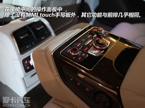轉(zhuǎn)至后排,這里應(yīng)該同樣是車主們最為關(guān)注的,依靠長軸車型多出的100mm軸距,后排的空間依舊不用擔心。而影音娛樂系統(tǒng)也同樣沒有被忽視,在座椅中間的操作面板中 ,除了沒有MMI touch手寫板外,其它功能與前排幾乎相同。