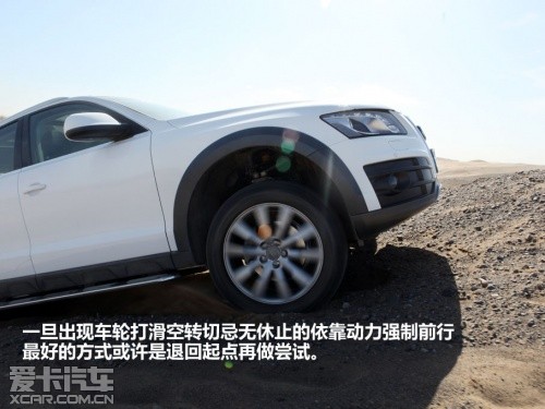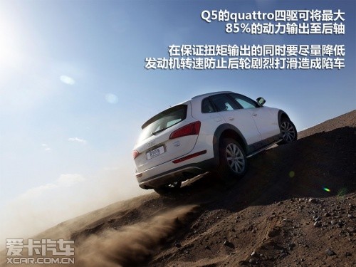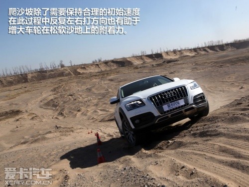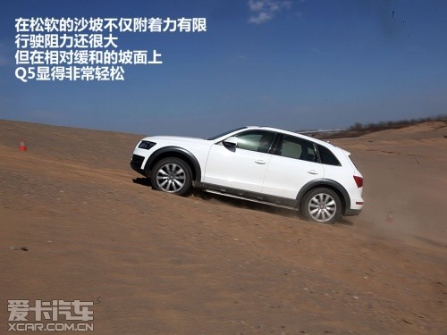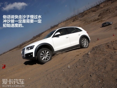 沙坡前半部分的坡度相對(duì)要緩一些,而奧迪Q5通過這里的過程自然也是毫不費(fèi)力。那么在接下來更陡的后半部分當(dāng)中,坡度的增大導(dǎo)致了車速急劇下降,此時(shí)松軟的沙子也就成為了車輛繼續(xù)攀爬的絆腳石,恰恰也就在此刻,檢驗(yàn)quattro四驅(qū)系統(tǒng)真正能耐的時(shí)候隨之而來。