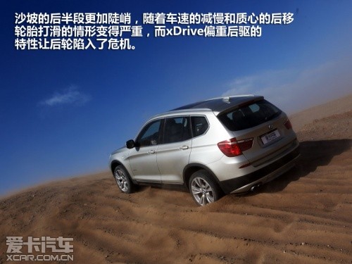 搭載3.0T發(fā)動(dòng)機(jī)的寶馬X3,很顯然比Q5更為“肌肉”,但面對(duì)松軟的沙坡它也清楚的知道:光有腿部力量是遠(yuǎn)遠(yuǎn)不夠的,還必須要結(jié)合上肢力量才有可能登頂,此刻,xDrive系統(tǒng)起到了決定性的作用。