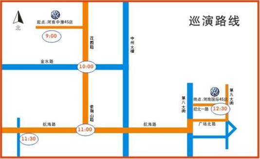 上午路線:進口大眾河南中豫4S店——紫荊山路——航海路——進口大眾河南中豫航海路展廳——進口大眾河南國際4S店