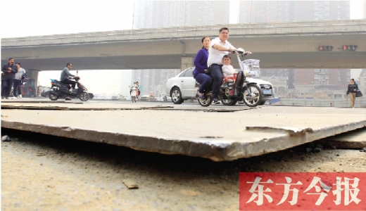 路人說:鐵板本來就比路面滑,再加上附近一直施工,經(jīng)常會有細土或砂石落在上面,就更加光滑,電動車、自行車和行人走在上面,不小心的話很容易滑倒。如果再碰到鐵板的棱角,后果就不堪設(shè)想。