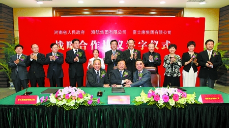 3月31日,河南省人民政府與海航集團(tuán)有限公司、富士康集團(tuán)有限公司戰(zhàn)略合作協(xié)議簽字儀式在??谂e行。省長郭庚茂,海航集團(tuán)有限公司董事長陳峰,富士康集團(tuán)有限公司總裁郭臺銘等出席簽字儀式。河南日報記者 董 亮 攝