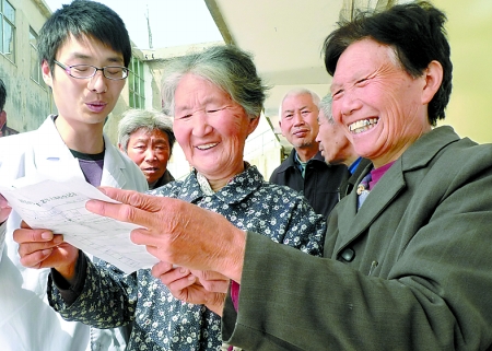 4月26日,湯陰縣白營鄉(xiāng)東木佛村老人們正在看自己的體檢報(bào)告。4月份,湯陰縣5萬多名60歲以上農(nóng)村老人享受到了一次免費(fèi)健康體檢,體檢費(fèi)用由政府買單。 常中正 攝