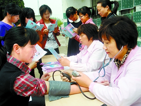 4月25日,商水縣舒莊鄉(xiāng)計(jì)生技術(shù)人員正在該鄉(xiāng)一中為教師進(jìn)行體檢?!拔逡弧鼻跋?,他們深入學(xué)校、機(jī)關(guān)、企業(yè)、田間,為辛勤工作在一線的廣大勞動(dòng)者免費(fèi)進(jìn)行健康檢查,并發(fā)放醫(yī)療保健知識手冊。 喬連軍 攝