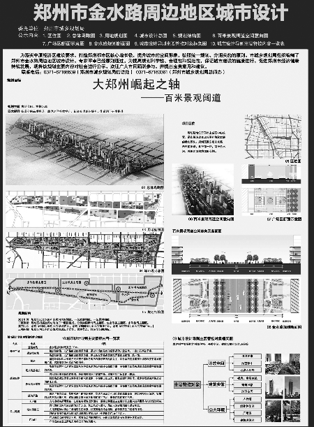 鄭州市規(guī)劃局相關(guān)負(fù)責(zé)人說(shuō),金水路未來(lái)路-南陽(yáng)路路段全長(zhǎng)約5公里,基本上是金水路最擁堵的地方。目前,該路段寬度在45米到60米之間。對(duì)此,鄭州市規(guī)劃局專(zhuān)門(mén)編制“鄭州市金水路周邊地區(qū)城市設(shè)計(jì)”,將金水路規(guī)劃紅線(xiàn)拓寬為100米。簡(jiǎn)言之,就是要將現(xiàn)在寬度為50米左右的金水路未來(lái)路-南陽(yáng)路路段拓寬成“百米景觀闊道”。該規(guī)劃方案已原則通過(guò)專(zhuān)家評(píng)審,正在鄭州市規(guī)劃局網(wǎng)站上進(jìn)行公示。