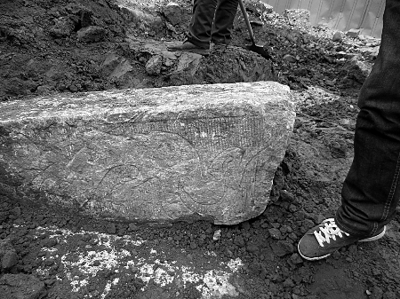 昨日上午,記者來到發(fā)現(xiàn)古墓的施工現(xiàn)場(chǎng),南陽市文物考古研究所考古人員已經(jīng)進(jìn)駐該工地,著手發(fā)掘工作。這座古墓位于該市臥龍路與車站路交叉口南側(cè)約700米處,4塊大小不一、形狀各異的大青石散落在工地中央,其中兩塊仍半掩在泥土中,依稀能看到上面刻有圖案(如圖),現(xiàn)場(chǎng)還有不少灰色磚塊。