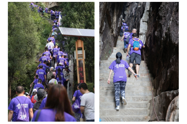 行至盧崖瀑布,泉水自山崖逐級跌落,聚水成潭,仿似人間仙境,令人流連忘返;稍事休整后,1000位登山者通過吊橋、一線天,沿途崖壁陡削,奇石林立。不少人已經(jīng)開始吃力,身強力壯的男士拉著女友的手一步一臺階地共同攀爬,稚嫩的孩童和爸爸媽媽一起,大手拉小手一邊說笑、暢享山水風(fēng)光,一邊努力克服陡峭險阻的山路。到了峰頂,無論是浪漫的情侶還是幸福家庭,在群山之巔“一覽眾山小”,感悟真誠和熱情、信任與支持,體會共擔(dān)風(fēng)雨的愛之真諦。