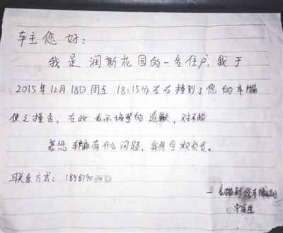 事情發(fā)生在12月18日。柏宇告訴成都商報(bào)記者,當(dāng)天下午她外出買(mǎi)了冒菜回家,走到小區(qū)門(mén)口,一不留神撞到了旁邊一輛轎車(chē)的車(chē)頭,彎腰擦膝蓋時(shí)發(fā)現(xiàn),轎車(chē)車(chē)牌面板被撞彎了。隨后,她跑回家寫(xiě)了一張字條然后把字條貼到了轎車(chē)擋風(fēng)玻璃上,“車(chē)主您好,我是潤(rùn)新花園的一名住戶,我于2015年12月18日周五18點(diǎn)15分左右撞到了您的車(chē)牌,使之撞歪,在此表示誠(chéng)摯的道歉,對(duì)不起,若您的車(chē)牌有什么問(wèn)題,我將全權(quán)負(fù)責(zé)”,她還留下了手機(jī)號(hào)碼。