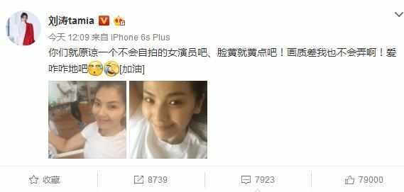 近期,劉濤在微博上面曬出了兩張照片,附文“你們就原諒一個不會自拍的女演員吧、臉黃就黃點吧!畫質(zhì)差我也不會弄?。壅φΦ匕伞?!