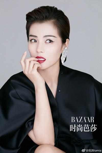 為雜志拍攝大片的時候,劉濤身穿黑色的寬松衣服,后背短發(fā),烈焰紅唇,個性十足的耳飾,整體造型又酷又美的!