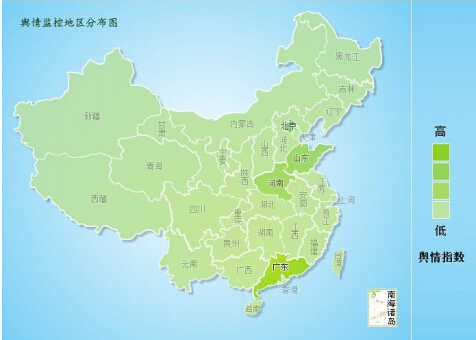 下圖為輿情監(jiān)控地區(qū)分布圖,大象輿情研究院通過對此事件相關(guān)報道網(wǎng)站ICP監(jiān)管所屬地區(qū)的挖掘分析,廣東媒體的傳播活躍度最高,這與廣東地區(qū)歷來開風氣之先、敢作敢為的特征相吻合;其次是 北京、山東、河南的媒體。