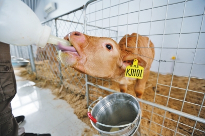 技術(shù)員呂博說(shuō),小牛犢們也是一日三餐,每次喂2公斤奶粉外,還加些犢牛顆粒飼料和干草。預(yù)計(jì)3個(gè)月大后,將逐步給它們斷奶。