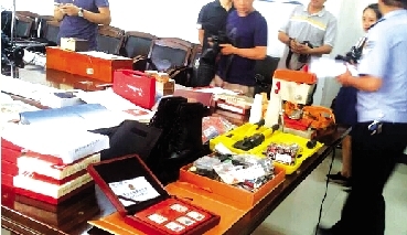 在警方展示贓物的現(xiàn)場,各種玉石、陶瓷、珠寶、金表、類似兵馬俑的古董、冬蟲夏草、古書、紀(jì)念幣、郵票、筆記本電腦、平板電腦等滿滿一桌子物品著實(shí)讓人看得眼花繚亂。