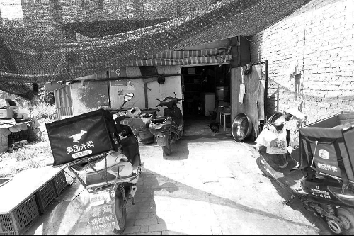 鄭先生所說的作坊,位于某高校東門對面不遠(yuǎn)處的一座廢墟旁。如果不是在中午時分,店內(nèi)不斷傳出鍋勺碰撞的聲音和門口停著的幾輛后置送餐箱的電動車,很難注意到這個僅有10多平方米大小、由破舊的門板搭成的小屋是一家“飯店”。