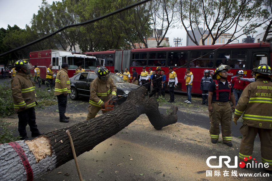 當?shù)貢r間2014年5月8日,墨西哥墨西哥城,消防人員正在切割一棵倒下的樹?!D片來源:Rebecca Blackwell/東方IC