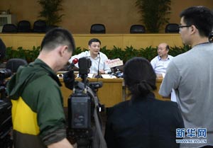 5月18日,杭州市環(huán)保局長(zhǎng)胡偉(左)在發(fā)布會(huì)上回答記者提問。