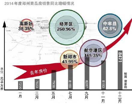 鄭州去年12月份房?jī)r(jià)達(dá)到8471元/平方米,達(dá)到歷史最高水平,相比于去年年底漲了1181元。即便如此,經(jīng)開區(qū)和航空港區(qū)商品房銷售翻倍。隨著拆遷的進(jìn)行,租房?jī)r(jià)格也一路走高,商鋪房租上漲10%,住宅房租漲幅達(dá)15%。