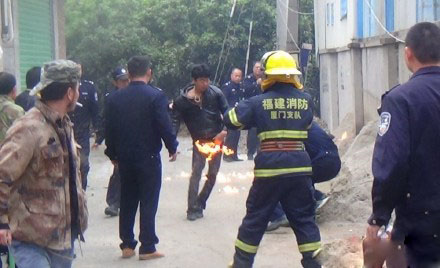 1月26日,廈門同安行政執(zhí)法局西柯城管中隊(duì)在拆除違建過程中,被違建者潑汽油瓶,造成多名執(zhí)法人員燒傷。違建者柯某的妻子爬上違法建筑的二樓,點(diǎn)燃汽油票向執(zhí)法人員投擲,并搬出兩罐煤氣罐,同時(shí)在自己身上澆灌可燃液體并手持打火機(jī),表示要同歸于盡,柯某到場(chǎng)后撿起正在燃燒的液體瓶向城管中隊(duì)長(zhǎng)撲去,造成其和另一名隊(duì)員燒傷。因妨害公務(wù),柯某昨已被刑拘。