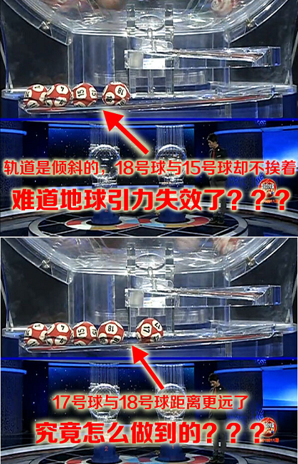網(wǎng)友@林建章67:雙色球2015011期搖獎(jiǎng)視頻疑有貓膩!軌道是傾斜的(左低右高),14號(hào)、4號(hào),正常,15號(hào)就不正常了,搖搖晃晃不想與4號(hào)挨著,18號(hào),干脆與15號(hào)不挨,17號(hào),距離更大了……難道地球引力失效了?還是球體有問題?3分08秒,一起鑒定。