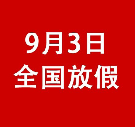 國(guó)務(wù)院發(fā)通知:中國(guó)人民抗日戰(zhàn)爭(zhēng)暨世界反法西斯戰(zhàn)爭(zhēng)勝利70周年紀(jì)念日(9月3日)放假一天!為方便公眾安排假日期間生產(chǎn)生活,特作如下調(diào)休:9月3日至5日調(diào)休放假,共3天。其中9月3日(星期四)放假,9月4日(星期五)調(diào)休,9月6日(星期日)上班。