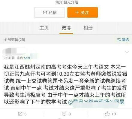 2、贛州定南4個(gè)高考考場(chǎng)發(fā)錯(cuò)試卷