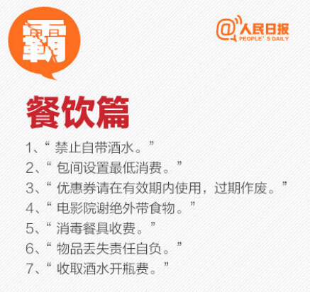 消協(xié)指出,影院禁帶食品屬霸王條款?!安蛷d禁止自帶酒水”“包間最低消費xx元”“一經(jīng)售出,概不退換”“本方擁有最終解釋權(quán)”“物品丟失本店概不負(fù)責(zé)”……熟悉吧?都是霸王條款!如果遇到,果斷打12315投訴,再不忍氣吞聲!為自己擴散