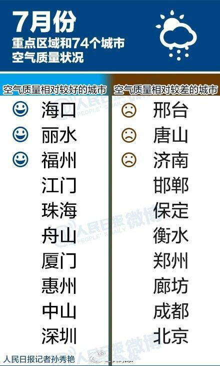環(huán)保部今天發(fā)布7月城市空氣質(zhì)量狀況??諝赓|(zhì)量相對(duì)較差的后10位:邢臺(tái)、唐山、濟(jì)南、邯鄲、保定、衡水、鄭州、廊坊、成都和北京;空氣質(zhì)量相對(duì)較好的前10位:???、麗水、福州、江門、珠海、舟山、廈門、惠州、中山和深圳。